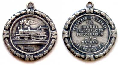 Also resulting from this was the resumption of work on the extension to Gaiman. This new track was laid with second-hand 65lb rail (32.25kg. per m.) from the Buenos Ayres & Rosario Rly. The sleepers were now wooden and in fact a law of 1907 (the 'Mitre' law) required the use of native quebracho wood. There were 1300 sleepers per kilometre (2) or 1400 (3). During the construction work regrettably the powder magazine exploded one night, killing two Spanish labourers (4). The railway seems to have been unlucky with fire: in March 1914 there was a big fire at Trelew which destroyed the goods shed and three of the 20 ton open wagons. (4) The opening day was 9th February 1909. It was recorded later that Gaiman had a 300m. long loop and 260m. of sidings (3). The opening was also notable as the finale of the career in Patagonia of Edward Jones Williams, He had been the initial surveyor of the railway, had managed some of the construction and had remained as General Manager from 1890 until 1907, but was now returning to Britain for family reasons (5). His successors were Mr. Berry, the railway's accountant, and then Senor C. T. Alt who remained as manager until the state takeover in 1922, and as the owners' representative for some time after that. The extension to Gaiman was commemorated, as on previous openings, by the issue of a medal. This one is in Gaiman Museum whose then curator, the late Miss Tegai Roberts, kindly allowed it to be copied. Note the 4-4-0 loco, unlike anything the FCCC possessed, and the January date which was not quite achieved!