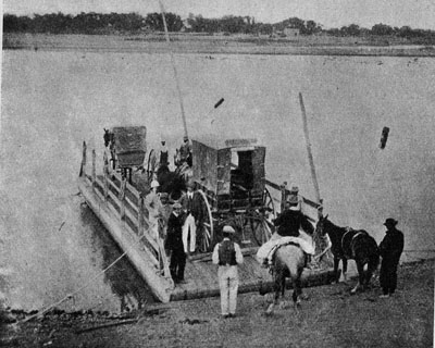 In 1910, the rafts were still operating but the road vehicle had changed. Note the chauffeur with his peaked cap, goggles and leather leggings. (0A)