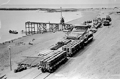 Immediately east of the station was the new 1928 muelle and harbour. The construction works for this are covered mostly in Chapter six. The port eventually had its own locos and rolling stock, mentioned on the next page. There were also 75cm gauge tracks at this location, between the workshops at Km 5 and Rada Tilly away to the south. In this view, taken in February 1943, the giant hammerhead crane is unloading broad gauge platform wagons from a lighter. Smaller mobile steam cranes and a port loco are a little further back. The 75cm. gauge tracks are also visible. In the far distance Cerro Chenque rises above the town.