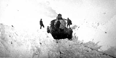 Visitors in the summer, seeing the hot dry windy plains of Patagonia, rarely consider what conditions can be like in winter. These two photos illustrate what the railway had to cope with. The upper picture taken in the 1930s shows a pacific on a newly cleared piece of line, whilst the lower shot, from the '50s or '60s shows a more difficult situation. Both photos were taken near Pampa de Castillo. Note the big square kerosene headlamp in the earlier picture, replaced by an electric lamp in the later one.