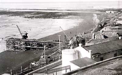 Early days at the coast (2). The Maciel muelle is under construction and there appear to be piles of materials. Whether the oil drums were brought in to provide fuel, or were early samples of the area's main export, is not clear. This muelle was eventually strongly reinforced and it lasted at least until the building of the new harbour in the late 1920s.