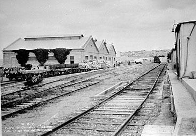 This picture shows the yard at the landward end of the main muelle, with Galpon Aduanero no. 1 on the left, and Barracas nos 1 and 2 on the right. A small tank engine stands in the distance. The creeper on the left hand building implies that this was some years after the construction of these facilities. (4)