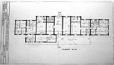 The architectural drawing below is a recent one of the ground floor of the main station in Comodoro Rivadavia. The platform side is towards the bottom of the plan, and the town side twards the top. The original building was totally symmetrical, comprising the five central bays (with extra depth front to rear) and a single shallower bay at each end. It can therefore beseen that extra rooms were added at each end (during the railway's occupation of the building) and out onto the platform (after the closure). (1).