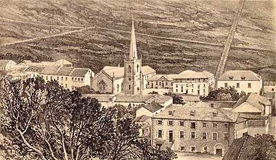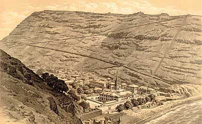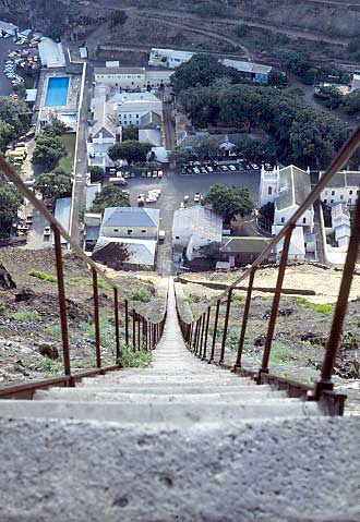 Further out into the Atlantic - a couple of rather smelly railways! There are four other islands in the South Atlantic, two of which have had railways. These two do stretch the geographical boundaries of this website more than a little, but I know of no other web pages considering these lines! St. Helena and Ascension Island are both shown on the map above. The third and fourth islands - Tristan da Cunha, & the Brazilian island of Trinidad, do not seem to have had any railways and therefore are not shown on the map. A 'nightsoil' plateway... A famous feature of the town is Jacob's Ladder, a staircase of 699 steps leading to a fort high above. It was constructed in 1828-9 with plateway inclines (using flat plates with flanged edges for ordinary wagon wheels to run on) to a four foot gauge on either side of the steps (1). G. W. Melliss was the engineer, under the direction of the Honourable East India Company's Governor, Brigadier General Dallas (2). The precedents cited in late 1828 were similar inclines at Bridgenorth and Monmouth (13). Just four years later the island passed from 'John Company's' rule to the British Government. It appears that the plane was built privately though with government investment. In 1832 the plane was bought from its proprietors by the island government for £882 10s. The engraving below from 1863 shows Jamestown with the incline clearly visible up the cliff to the right (3). The illustration and others further down the page were found in the St. Helena Virtual Library and Archive maintained by Barry Weaver. This was powered by donkeys or mules turning a drum at the top, and its main purpose was to lift 'nightsoil' or sewage up at night to be spread on the fields as a fertiliser. Stores were also taken up to the Ladder Hill fort, and farm produce lowered down into the town. Apparently the breakage of haulage chains led to 'unpleasant results below' and an emergency braking system was developed involving trailing spikes which would dig into the track in the event of a runaway. This was described and illustrated in detail in editions of the Mechanics' Magazine during 1832 and 1843. The relevant pages are available on an appendix page. The incline had been abandoned by the time that the ladder was reconstructed in 1875. More detail is given in an 1875 book (14) by J. C. Melliss, ex surveyor and engineer of the island, who was the son of G. W. Mellis, the incline's builder. The extract below summarises the incline's purposes, construction and eventual dereliction: The whole of the manure, which accumulates from stables, stockyards, &c., in the town, is thrown into the sea, instead of being conveyed up the hills, and returned to the land. By this long-continued practice the lands have become almost exhausted. Moreover, a large quantity of guano, collected around the coast, is exported to Europe, instead of being used in the Island, and it is much to be regretted that the Government permit it, merely for the sake of swelling the revenue by a paltry charge of 10s. per ton exportation fee. With such a system continually at work, is it surprising that the farmer obtains but a poor crop, and fruit trees blight and dwindle away ? rather is it a matter of astonishment that he obtains any return at all. Forty two years ago General Dallas, then Governor of the Island, was fully alive to this most ruinous system, and, with a view of supplying some practical means for lessening the cost of conveying the manure from the town up the hills, and back to the lands in the country, caused the erection of the ladder or inclined plane. This engineering work, carried out under the directions of Lieutenant G. W. Melliss, an artillery officer, comprised a ladder 900 feet in length, with upwards of 600 steps, communicating up the side of the hill from Jamestown to Ladder Hill, at an angle of 39' or 40', with a tramway on either side, upon which waggons, in connexion with ropes and machinery at the top, travelled up and down. By this means manure was conveyed up an almost perpendicular height of 600 feet and deposited, from whence it could easily be conveyed by the farmers. A secondary use of this "St. Helena Railroad" was to convey stores from the town to the garrison stationed in the Fort of Ladder Hill, and, as it would be most invaluable for both these purposes in the present day, it is very greatly to be regretted that the whole construction has fallen into disuse and bad repair, the woodwork being eaten by white ants. Indeed, it is said that these insects visited Ladder Hill through the medium of its longitudinal wooden sleepers. The second engraving is from a little closer, and was produced in 1857 (4). Again the incline is clearly visible. A modern picture by Barry Weaver looks down the ladder to Jamestown. Either side of the steps there is a sloping ramp of stone blocks. Whilst the whole edifice was reconstructed in 1875 these ramps may well have played a role as foundations for the plateway track. Technical details of the arrangements, winch and runaway protection devices were published in the Mechanics Magazine in 1832 and 1834. Scans of these articles are available in an appendix page. More information about the Ladder Hill funicular plateway can also be found on the Funimag website. Coal and fresh water Somewhat later, in 1901, Rupert's Bay became the site of a sea-water desalination plant for the Boer War prisoner-of-war camps on the island. The plant was built, and tested, but was never used in earnest, though a large brick chimney survives. The map below shows the site of the desalination plant at the south end of the bay. A trolly (sic) line is shown, possibly of some length as it leads off the map at two points. The northerly line may well have brought in coal from the quay area mentioned above, whilst the southerly spur heads inland up the valley. The big chimney shown in the photograph further down the page is the small shaded square just south of the east-west rail li