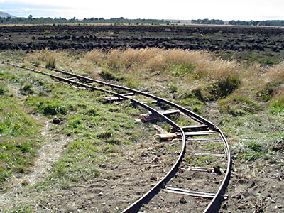 The photo below shows a rope-worked incline in use during the construction of the Florentino Ameghino dam (6). The temporary 75cm gauge branch from the FCCC mainline approached across the top of the plateau, behind the photographer. The dam itself was behind the spur of rock to the right. Much of the construction work was based down in the valley and the incline was therefore constructed to lower materials down to the base level. It is surmised that the incline was of 60cm gauge and linked to Messrs Grun & Bilfinger's operations, but this photo does not provide proof of this, as it might be of 75cm gauge. Contractors' narrow gauge systems utilised during the construction of the permanent railways. An Orenstein & Koppel tank loco is carried through the streets of San Antonio Oeste during the broad gauge construction works there (7). The lorry is almost as interesting, and is an early Mack 'Duncan Fox, Patagonia' Bariloche Peat workings on Staten Island (Isla de los Estados) A new peat bog railway The first picture shows a line running along the edge of the working bog, with a branch leading off into the middle of the workings. The track is of 60cm gauge, in panels imported from Sweden.